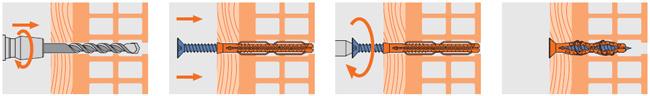 Специальная конструкция дюбеля для ML6 и ML8, заворачивание шурупа вызывает скручивание дюбеля